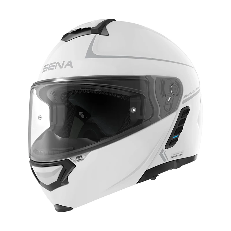 Impulse è uno smart helmet modulare con tecnologia di comunicazione Sena Mesh™ e Bluetooth® Intercom, e con altoparlanti e microfono premium disegnati dagli esperti del suono di Harman Kardon. Grazie alla collaborazione con Harman Kardon, gli altoparlanti sapientemente sintonizzati di Impulse garantiscono un nuovo livello di precisione e chiarezza all’audio all’interno del casco, in più un nuovo microfono offre una qualità del suono in uscita impareggiabile. Il casco è dotato di una luce di posizione posteriore integrata per la visibilità del pilota e di un comodo parasole retrattile. La calotta di Impulse è in fibra di vetro composita certificata
