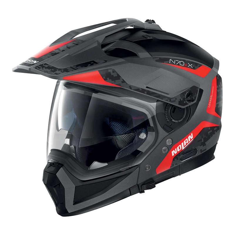 E’ il nuovo crossover da strada e fuori strada top di gamma di Nolan, il primo casco on-off dotato di mentoniera protettiva amovibile sul mercato. Si caratterizza per il design d’ispirazione off-road, le ricche dotazioni tecniche e la buona disponibilità di colori e grafiche. Volume contenuto (grazie alla disponibilità di due misure di calotta esterna), doppia omologazione P/J, visiera ultrawide, oblò particolarmente ampio compatibile con l’uso della maschera (anche a visiera montata e aperta), schermo parasole VPS (regolabile in svariate posizioni e dotato di sistema di richiamo automatico), sistema di ventilazione superiore AirBooster Technology, sistema di ritenzione con regolazione micrometrica a doppia leva Microlock2, innovativa imbottitura interna di conforto Clima Comfort (con tessuti micro-forati e paranuca regolabile) e predisposizione per il sistema di comunicazione N-Com vogliono fare di N70-2 X il crossover da strada e fuori strada di riferimento per il moto-turista più esigente
